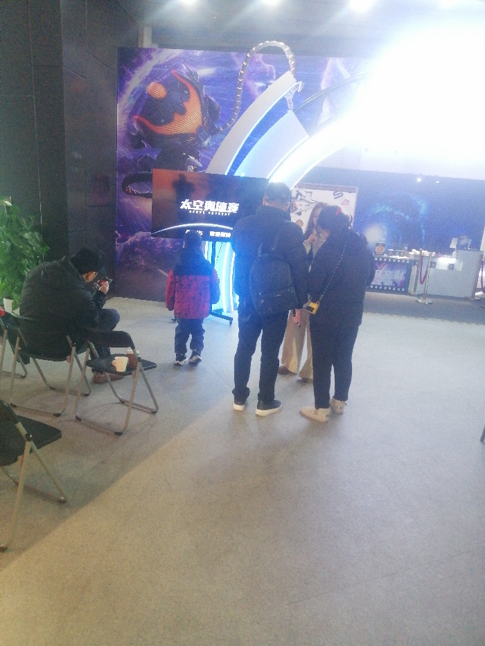 The image captures an indoor scene within a commercial or exhibition space located in Fengtai District, China. The environment features a light gray floor and dark walls. A large digital display dominates the background, showcasing a vibrant purple and blue space-themed graphic with an abstract orange and black character. A metallic architectural structure arches above this display. A screen embedded below the character displays Chinese characters "太空與城堡" (Space and Castle) and "APOLLO SATOSHI." Intense overhead lighting creates a bright glare from the upper right quadrant. On the far left, a green potted plant is visible. Two black folding chairs are arranged, with a male subject seated on one. He wears a dark jacket and pants and is looking down at a white object, possibly a mobile device. A white paper cup rests on the floor near his feet. In the mid-ground, a young subject, likely a child, stands facing the main display, wearing a red and blue winter jacket and dark pants. To their right, a group of three adult subjects is present. One male subject, seen from the back, wears a dark jacket, dark pants, and carries a black backpack. Adjacent to him, two female subjects stand; one is seen from the back, wearing a dark jacket and pants, holding a yellow item (possibly a small bag) by a strap. The other female is partially visible from the side, wearing light-colored wide-leg pants and a dark top. This group appears to be observing the display or engaged in a conversation. To the far right, a counter or booth area with red velvet stanchions is partially visible.