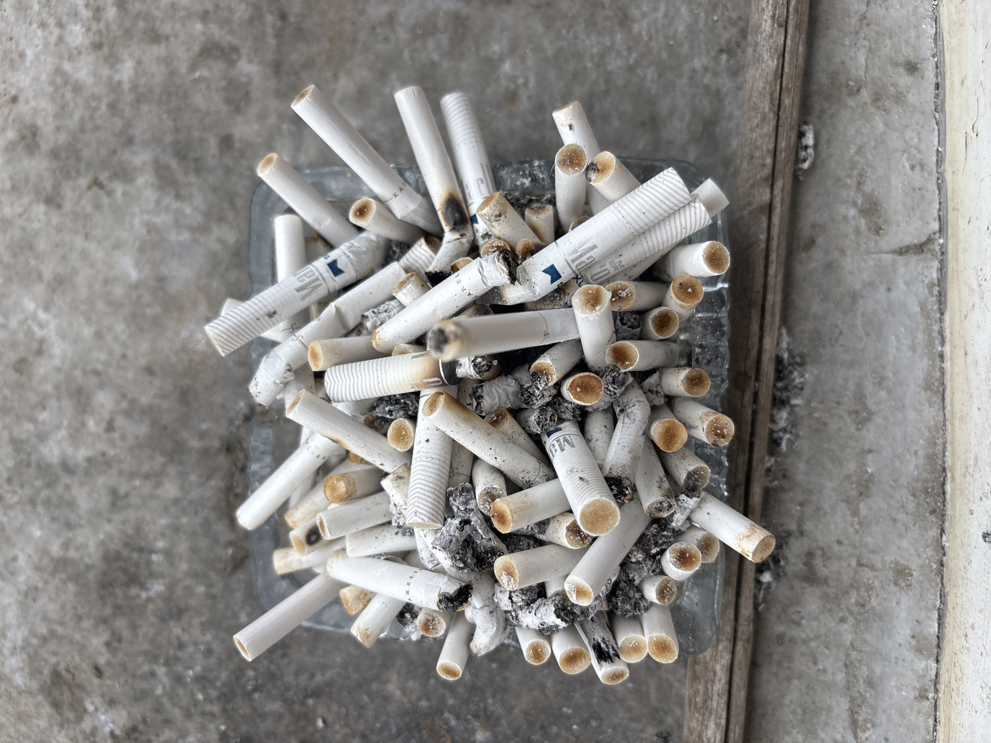 - "A clear, square glass ashtray, heavily laden with approximately 50-70 spent cigarette butts and ash, is centrally positioned on a mottled grey concrete or stone surface in Kozloduy, Bulgaria" by FM-hqpSj2, licensed under CC BY 4.0