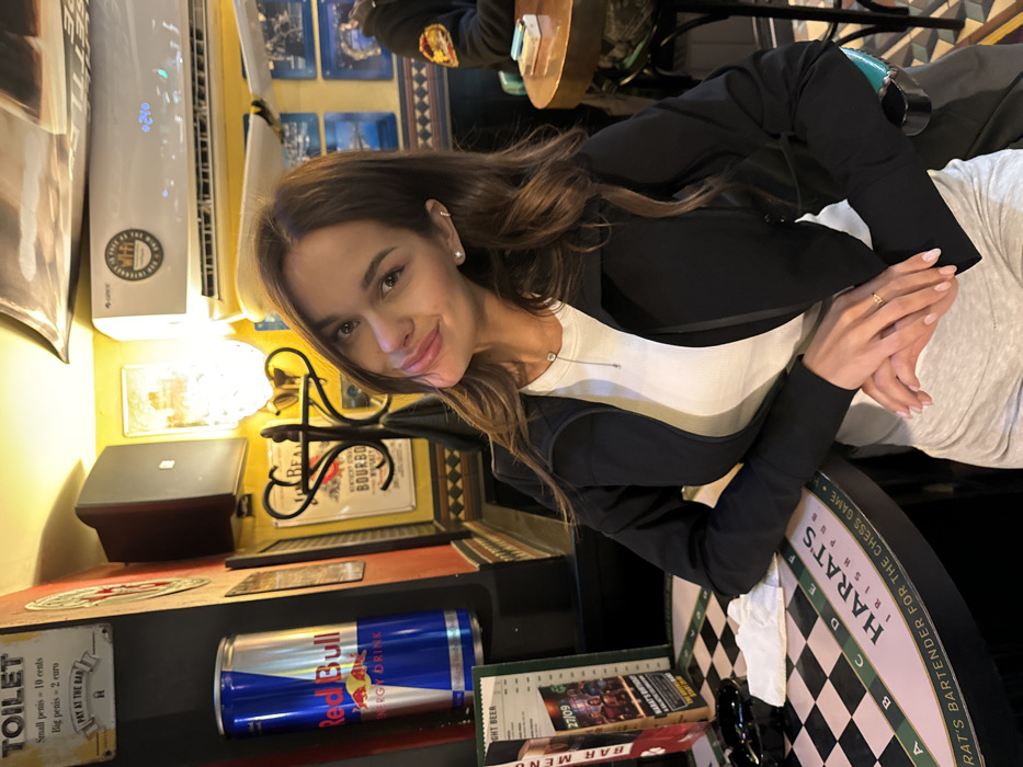The image displays a female subject seated indoors at a table within Harat's Irish Pub, located in Belgrade, Serbia. The subject, an adult with long brown hair, is centrally framed, looking at the camera with a slight smile. She is wearing a black zip-up jacket over a white ribbed long-sleeve top and light grey bottoms. A delicate necklace and small stud earrings are visible. Her hands are resting in front of her on a round table designed with a chessboard pattern, bearing the text "HARAT'S IRISH PUB" and "HARAT'S BARTENDER FOR THE CHESS GAME". On this table are a black ashtray, a white napkin, sunglasses, and a menu stand advertising "BAR MENU" and "27/09 HARAT'S BIRTHDAY". The background reveals yellow-painted walls adorned with various decor. To the immediate left of the subject, a blue and silver Red Bull Energy Drink can stands on a ledge, below a wall-mounted black speaker. Above the Red Bull can, a metal sign with "TOILET" is visible, listing prices for "Small penis - 10 cents" and "Big penis - 2 euro". Other signs in the background advertise "OLD No 7 BRAND JACK DANIEL'S TENNESSEE WHISKEY" and "JIM BEAM KENTUCKY STRAIGHT BOURBON WHISKEY". A black, multi-hook coat rack is positioned centrally in the mid-background. In the upper right quadrant, a white GREE brand air conditioning unit is mounted, displaying "0240". A partially visible individual is seated at a dark wooden table to the far right, where a pack of cigarettes and a lighter are present. The establishment is illuminated by warm artificial lighting.