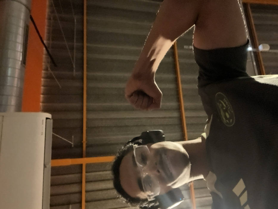 A male individual is depicted in a low-angle photograph, from the chest up, flexing his right bicep while smiling at the camera. He wears clear-framed glasses, dark over-ear headphones, and a dark short-sleeved shirt featuring a light-colored circular logo on the chest. He has dark, curly hair and a mustache. The background indicates an indoor industrial-style environment, identified as being in Strasbourg, France. Visible elements include corrugated metal paneling on the upper wall or ceiling, orange structural beams traversing the scene, a white wall-mounted air conditioning unit in the upper left, and a silver corrugated ventilation duct in the upper right. The scene is illuminated by artificial light, casting highlights on the subject's right forearm and bicep.