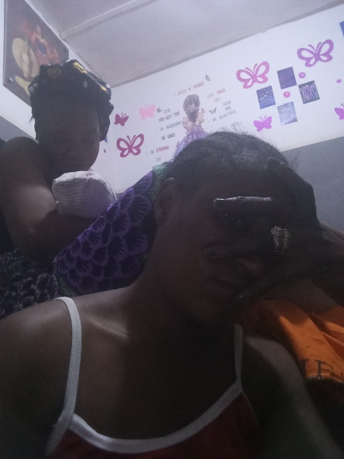Two dark-skinned women are pictured indoors. The woman in the foreground wears a red and white tank top and rests her head on her hand, which has a ring on one finger. The woman in the background is seated and wearing a black and yellow hair wrap. She holds a striped pillow or cushion. The room has light-colored walls adorned with butterfly decorations and motivational sayings. A picture hangs on the wall. The lighting is dim and casts heavy shadows.