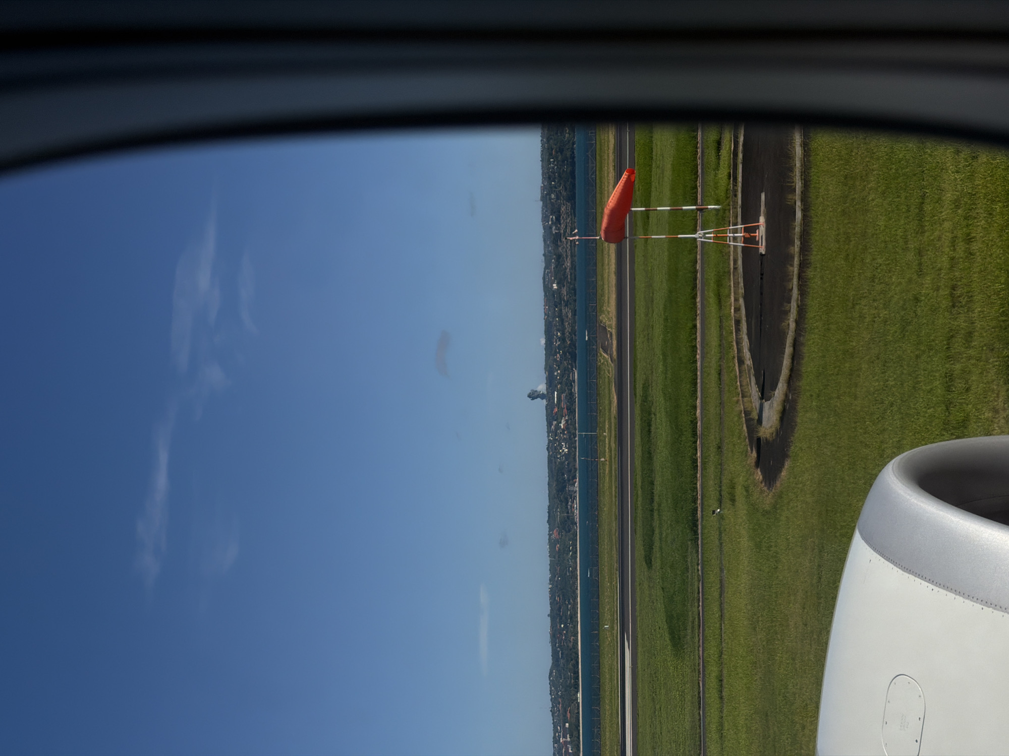 The view from an airplane window on a sunny day reveals a runway and grassy terrain