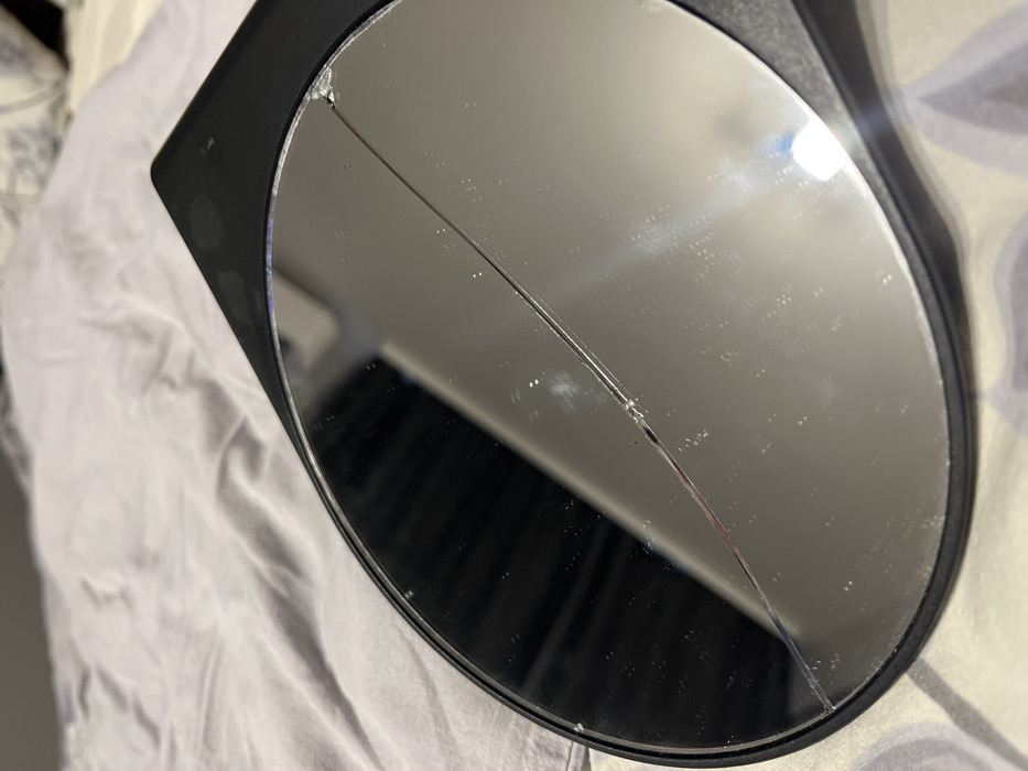 - "A circular mirror with a black plastic frame is depicted resting on a light grey or off-white patterned fabric surface, consistent with bedding" by FM-GdSvQ2, licensed under CC BY 4.0