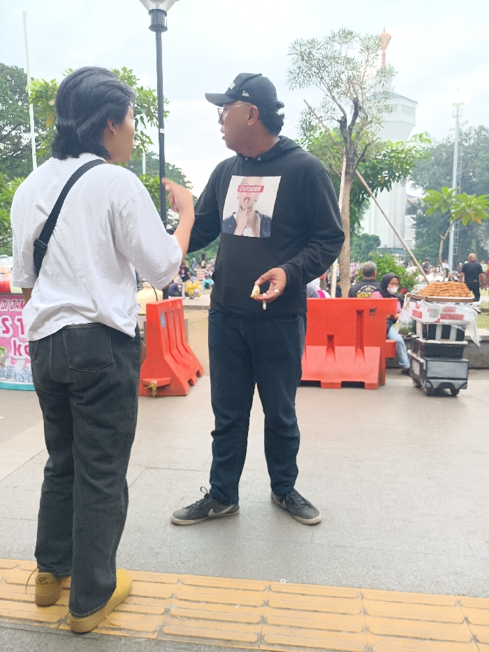 Two men are standing on a paved pedestrian walkway in front of a tall white building. The man on the left is wearing a white t-shirt, jeans, and tan shoes. He is looking at the man on the right. The man on the right is wearing a black hoodie with the word "OUTSIDER" in red across the front, black jeans, and black sneakers. He is wearing a black baseball cap, and looking at the man on the left. The man on the right is holding a small white object in his left hand. The men are standing in front of a red and white barrier. The scene is located in the city of Bogor, Indonesia, at coordinates -6.595 latitude and 106.791 longitude. The area is a public space with a sidewalk and a tall building in the background. There are also other people in the distance.