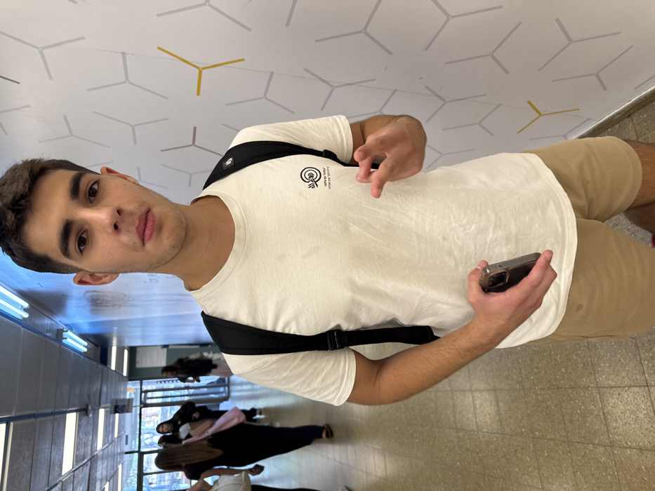 The image depicts a young male standing in a well-lit indoor hallway in Ness Ziona, Israel