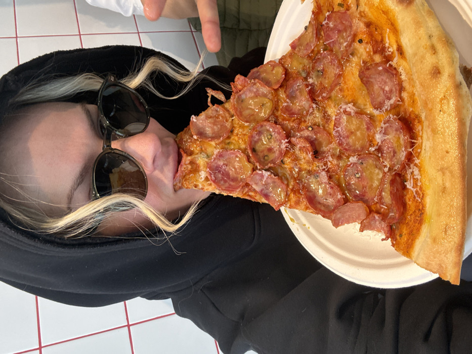 An individual is depicted consuming a large slice of pizza in a casual indoor setting. The person, positioned centrally, wears a black hooded sweatshirt with the hood up and dark, round sunglasses. Blonde hair is visible beneath the hood, particularly framing the face. The individual is actively biting into a triangular pizza slice, held on a white, disposable-style plate. The pizza is generously topped with numerous thinly sliced round pieces of cured meat, possibly salami or pepperoni, along with grated white cheese and a glistening sheen on the toppings. A second individual's hand, wearing a green sleeve, is partially visible on the right side of the frame, with an index finger pointed towards the pizza. The background features a white tiled wall with red grout lines, characteristic of a modern, casual eatery. While the specific establishment is not discernible from the visual evidence, the location is in the city of Sofia, Bulgaria, consistent with a pizzeria or quick-service restaurant.