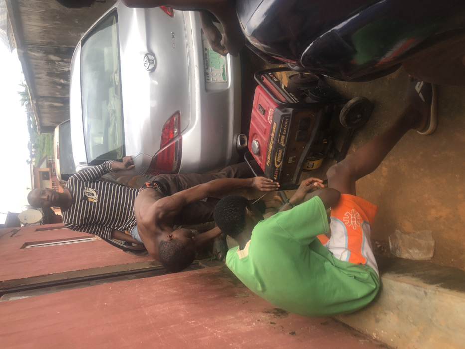 This image depicts an outdoor scene in Akpaka Forest Reser, Nigeria, featuring four males, a portable generator, and two vehicles in a confined space