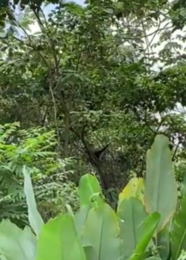 lush green vegetation in a tropical environment with a dark, unidentified animal perched in the upper branches of a tree