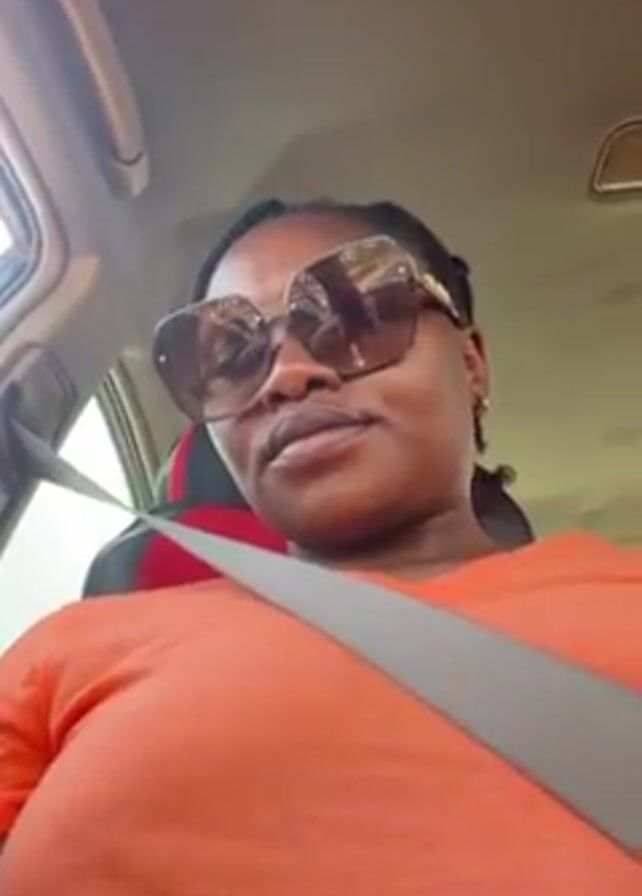 A woman wearing an orange shirt and sunglasses is sitting in a car. She is wearing a seatbelt. The car has a red and black seat cover. The woman has braids. The car's interior is visible. The camera is pointing up at the woman.