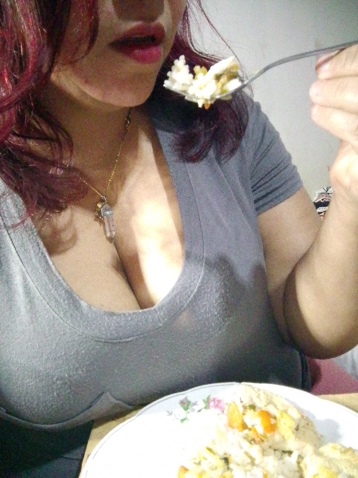 A woman with red hair and red lipstick is captured from the chest up. She wears a gray v-neck shirt and a necklace with a crystal pendant. She holds a fork filled with rice, poised to eat. A plate of rice sits below. Focus is on her torso, the fork, and the plate of rice.