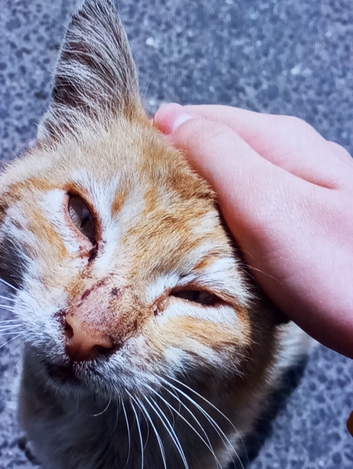 The image depicts a close-up, high-angle view of an interaction between a human hand and a domestic cat in Miękinia, Poland. The cat, appearing to be an adult or sub-adult ginger tabby with white markings on its muzzle and chin, is positioned looking upwards. Its fur around the eyes and nose is matted, and there are visible dark reddish-brown scabs or lesions on the bridge of its nose, extending vertically, and scattered around both eyes. Both eyes are partially closed, consistent with squinting, and the visible mucous membranes appear somewhat inflamed. A bare human hand, with light skin tone, is positioned on the top and right side of the cat's head (viewer's left), with fingers gently resting on the fur, indicating a petting action. The background is a blurred, dark grey, textured surface, likely concrete or asphalt, suggesting an outdoor or semi-outdoor setting under bright, direct illumination.