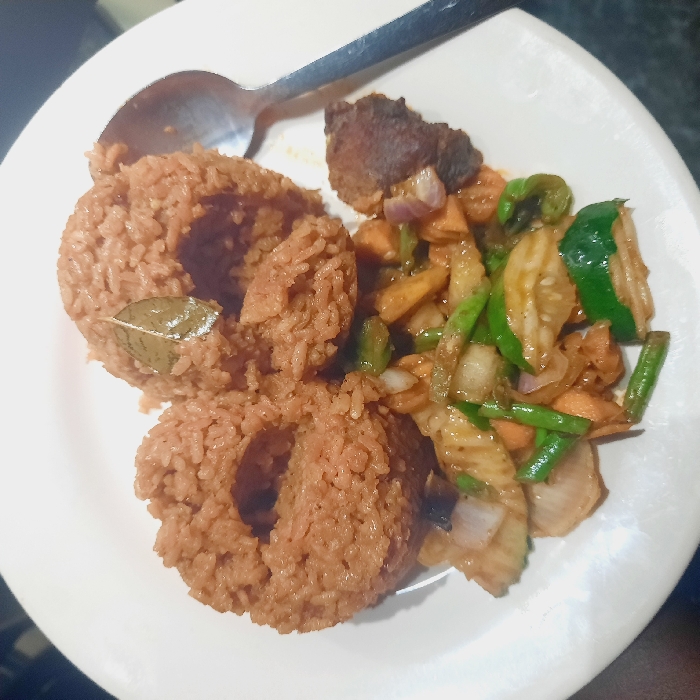 A white plate, possibly ceramic, contains two mounds of red rice, one smaller, partially obscuring the other, with a bay leaf partially embedded in the larger mound. The rice is likely Jollof rice. There is a mix of sliced green peppers, green beans, onion, and diced carrots surrounding the mounds of rice. A dark, meat-like substance, likely fried, is lying on the bottom of the plate to the right of the rice, and a silver spoon is lying on the plate to the right of the rice and the meat. The plate is being held with a hand partially obscured by the plate's rim. The image appears to be taken inside a restaurant, and the location in Barakin Rafin Gora, Nigeria, does not provide any further details about the scene.