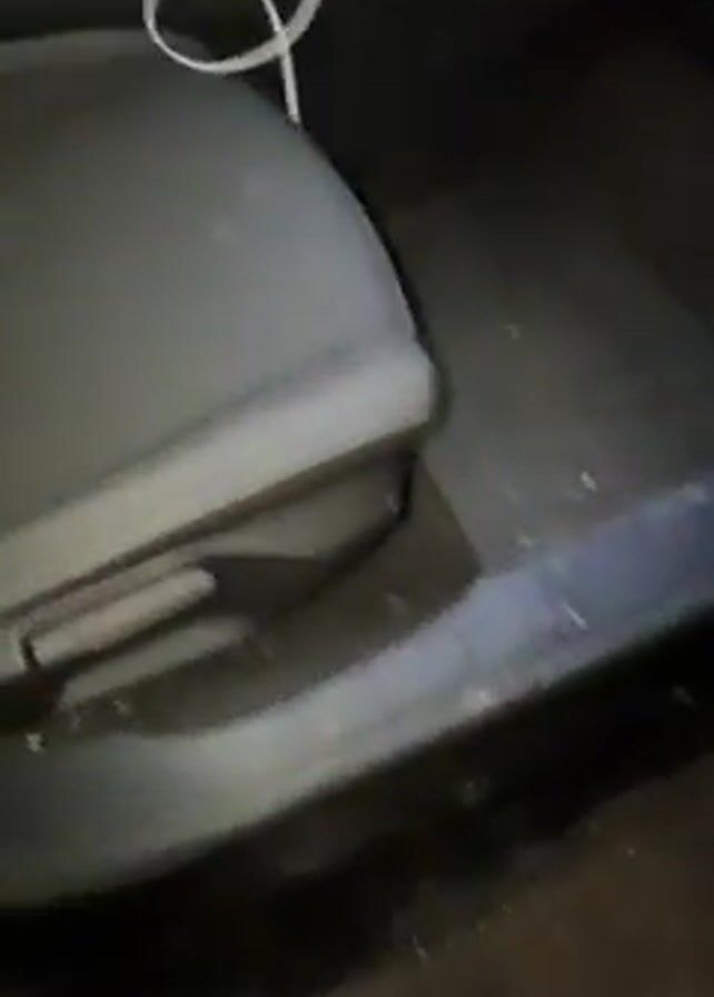 The interior of a car is shown, focusing on the driver's side. The door is open and the black interior is visible. A black car seat with a white charging cable is in view. A hand opens the compartment below the car's dashboard. There are several items inside, including a blue tube, a marker, and some other small objects. The hand picks up the blue tube, and then closes the compartment.
