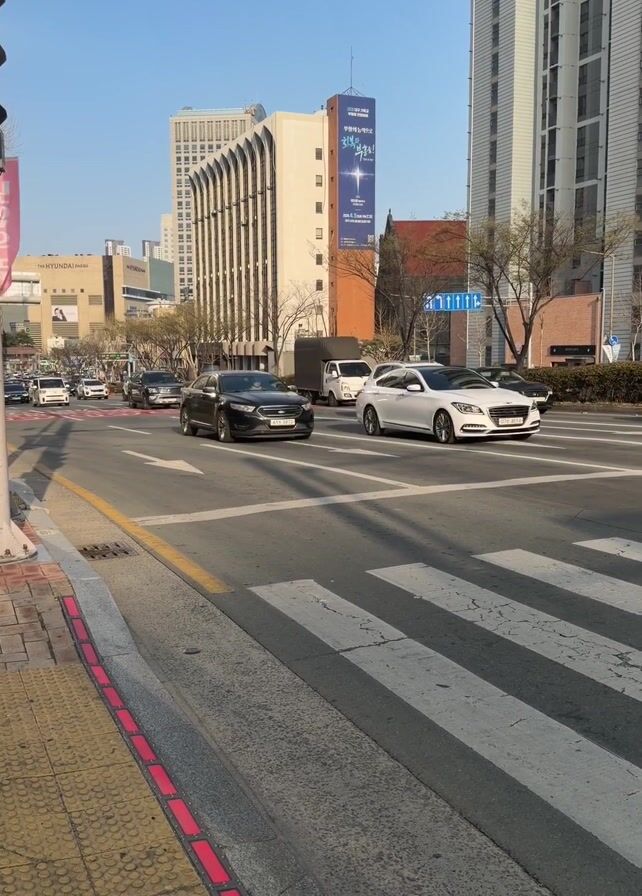 The video depicts a street scene in a city with moderate traffic