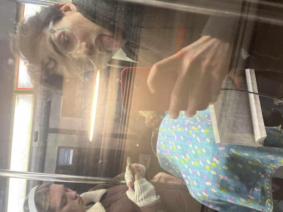 A person wearing glasses and a gray shirt grimaces behind glass with their tongue out. An arm holds a phone over a book, partially covering a seated person. This person is wearing a brown jacket with a white collar, white gloves, and a white headband. They are looking at a phone in their hands. All of the people are inside a bus or train. There are advertisements visible through the windows. The person with the book is wearing a blue flower patterned headscarf.