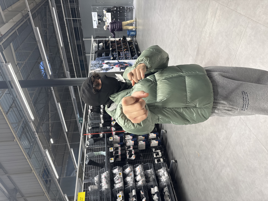 Inside a brightly lit retail store, a person wearing a black balaclava, light green puffer jacket, and gray sweatpants poses, pointing both fists forward