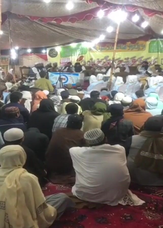 gathering of people sitting on the floor inside a large tent. They are facing a group of individuals seated at a table at the front of the tent, presumably speakers. The tent is decorated with lights and colorful banners. The people in the audience are dressed in various traditional clothes, including white caps and shawls. The carpet on the floor is red with a pattern. The atmosphere appears to be one of listening and attending to a speaker or event at the front.