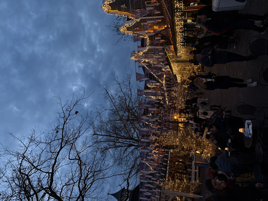 A twilight scene depicts a lively outdoor gathering. Strings of flags and fairy lights illuminate tables occupied by people. Above, bare trees reach towards a cloudy sky. The scene appears to be a festive market or outdoor event, possibly during the evening hours. The image is shot from below, capturing the festive ambience.