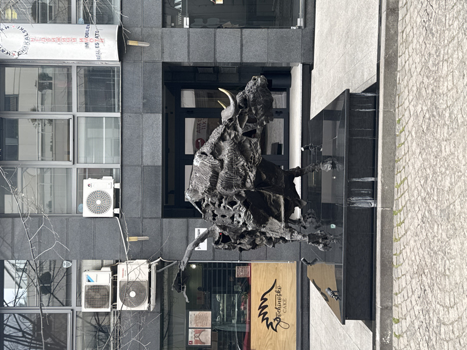 - "A large, abstract, dark bronze sculpture of a bull stands prominently on a multi-tiered black polished stone pedestal" by FM-tZgMG3, licensed under CC BY 4.0