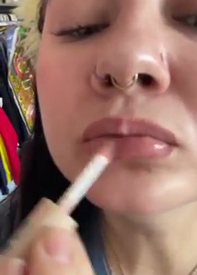 A close-up video shows a person applying lip gloss to their upper lip