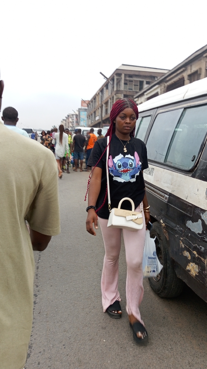 The scene depicts a busy street in Ogbunike, Nigeria, under an overcast sky. The foreground is dominated by two individuals. On the left, a person, seen from the back, wears a plain light beige short-sleeved t-shirt. On the right, a young adult female walks towards the viewer, maintaining direct eye contact. She has red braided hair, a small stud piercing on her left nostril, and wears a black t-shirt featuring a 'Stitch' graphic, light pink ribbed wide-leg pants, and black platform slide sandals with white painted toenails. She accessorizes with a gold-colored dollar sign pendant necklace, a black beaded bracelet on her left wrist, and carries a small white shoulder bag with a light brown flap and a gold clasp across her body. A white plastic bag is held in her right hand. Immediately to the right of the female subject, a worn white passenger van or minibus is visible, partially obscured by the woman and extending out of frame. The vehicle's lower body panel shows visible scratches, dirt, and paint wear. In the midground and background, numerous blurred individuals are walking and congregating on the asphalt street. Multi-story urban buildings, appearing aged and constructed of concrete, line both sides of the street, extending into the distance under the pale sky. The overall impression is a vibrant urban thoroughfare with pedestrian and vehicular activity.