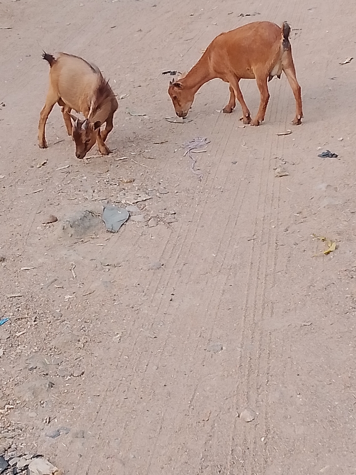 Two goats, both a light brown color, stand on a dusty ground with visible tire tracks. One goat has small horns and is bent down, appearing to graze. The other goat is taller and facing right, also with its head lowered. Debris, including what appears to be paper and plastic, litters the ground. The overall scene suggests a rural or semi-rural setting.