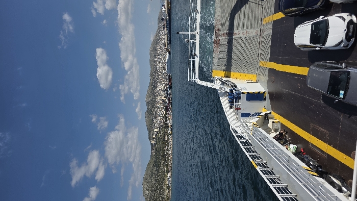 This image depicts a vehicle ferry on open water, with a large coastal city and hills visible in the distance under a blue, partly cloudy sky. The scene is located in the Saronic Gulf, in the vicinity of Ampelakia Municipal Unit, Greece, with the mainland city of Piraeus forming the distant background. The foreground shows the ferry's dark grey vehicle deck, marked with prominent yellow lane lines. A silver compact car, a white compact car (Toyota Yaris), and a dark-colored compact car are parked on the deck. A scooter or motorcycle is also present on the far left lane. Along the port side of the deck, a white metal railing with horizontal bars runs the length of the vessel. Two individuals are discernible resting or sitting on the deck near the railing; one is positioned beside a white waste receptacle and a green bag. White and blue sections of the ship's superstructure, including a yellow-marked ramp or gangway, are visible. The midground features a deep blue body of water, displaying moderate choppiness and reflections of sunlight. The background reveals a sprawling coastal city, consistent with Piraeus, built into and upon a series of green and rocky hills. The city consists of numerous densely packed, light-colored buildings. A significant port facility is evident, with multiple vessels docked, including a large white passenger ship or ferry and several darker-hulled industrial or cargo ships. Cranes and other port infrastructure are also visible. The sky above is clear blue with scattered white cumulus clouds.