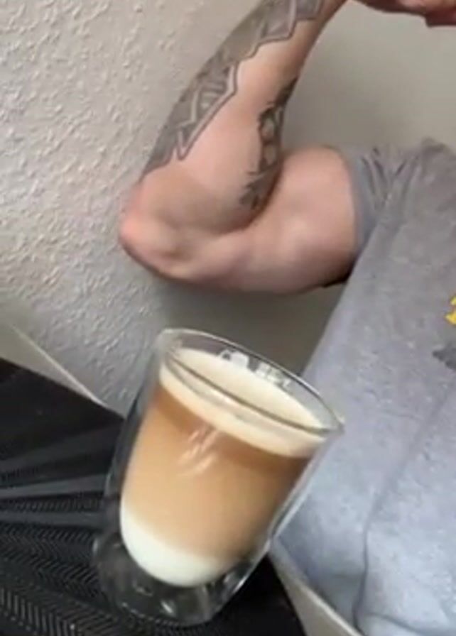forearm flexing with a tattoo on it next to a glass of latte. The arm belongs to someone wearing a gray T-shirt with yellow letters. The drink is in a clear glass. The background is a textured, white wall. The table is dark and patterned. The arm flexes throughout the video. The person says "Oh là là, une goutte de café".