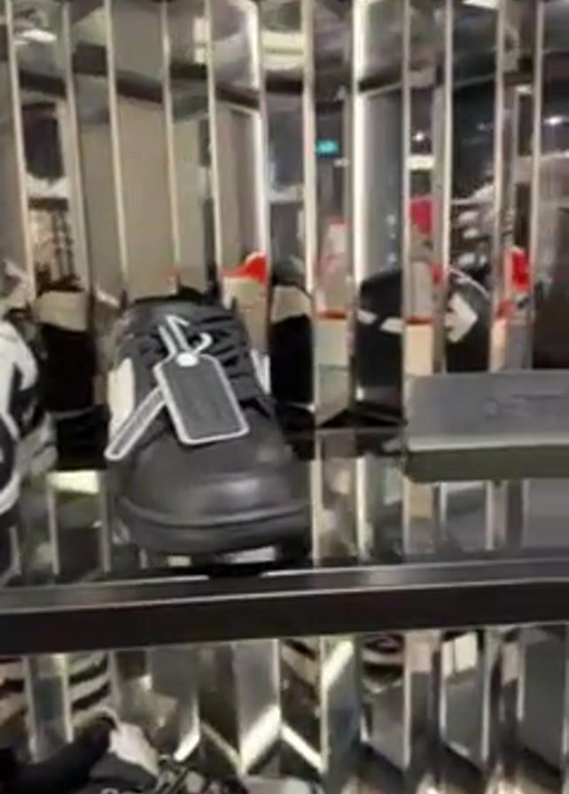 A close-up video shows a mirrored shelf unit displaying various Off-White brand sneakers