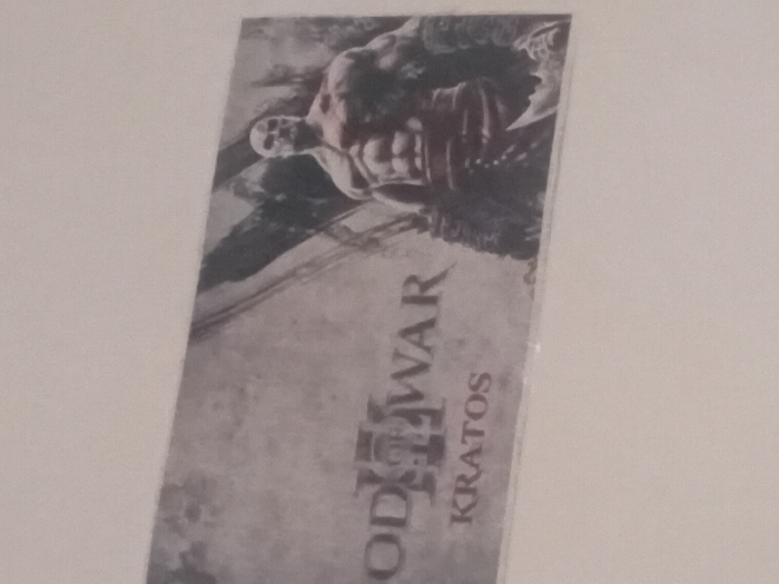 A rectangular poster, approximately 1:2 aspect ratio, is affixed to a plain, light-colored wall in Parand, Iran. The poster features grayscale imagery from the video game "God of War III." On the left, the text "GOD III OF WAR" is visible, with "KRATOS" prominently displayed below it. To the right, the character Kratos is depicted from the waist up, a bald, heavily muscular figure with red markings on his chest and arms, facing slightly left with a stern expression. He is partially obscured by dark, chaotic background elements suggestive of ruins or a battle. The poster appears to be mounted directly to the wall, with a slight upward tilt from left to right. The overall image is slightly blurry and grainy.