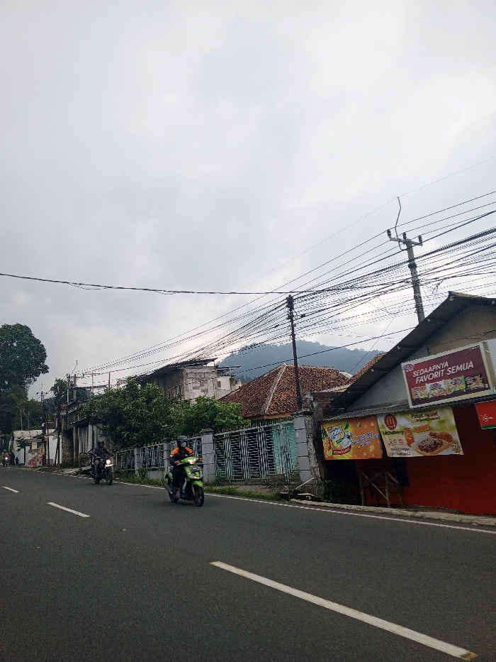 The scene depicts a street in the city of Qorday, Kazakhstan, under an overcast sky. A two-lane asphalt road extends into the distance, marked with a solid white line on the right edge and a broken white line in the center. Two motorcycles are in motion, moving away from the viewer. In the foreground-right lane, a person wearing an orange jacket and a black helmet rides a green scooter. To their left, a person in dark attire and a dark helmet operates a dark-colored motorcycle. A third, indistinct motorcycle is visible further down the road on the far left. Along the right side of the road, a red-fronted commercial building features two prominent signs. The upper sign displays the text "SEDAAPNYA FAVORIT SEMUA" alongside various food images. Below it, a McDonald's McDelivery banner advertises "Paket Hemat" with visuals of a burger, fries, and a pizza-like item. Several utility poles, heavily laden with a dense network of black electrical or communication cables, are visible along this side, extending into the background where a building with a reddish-brown tiled roof is present. On the left side of the road, a light-colored fence with horizontal bars precedes a row of buildings, some appearing aged. Green trees and dense foliage are interspersed, with a large tree prominent in the mid-ground. Vegetated hills or mountains rise in the distant background beneath the gray, cloudy sky.