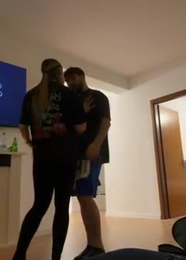 In a medium shot inside what appears to be a home living room, a woman and a man are dancing together