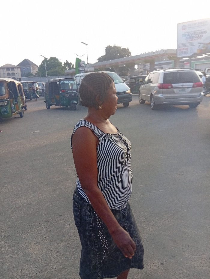 The image captures an outdoor urban scene in Aba, Nigeria, centered on a woman in the foreground