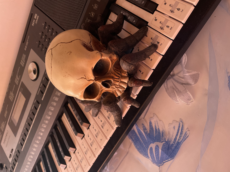 An electronic Medeli M15 musical keyboard is depicted from an elevated perspective, angled slightly downward, resting on a white tablecloth patterned with blue and light grey floral motifs. A decorative skull figurine, off-white with visible cracks on its cranium and an aged appearance, sits upon a dark brown, multi-legged figure resembling a tarantula. This combined object is positioned on the white keys of the keyboard. The arachnid-like figure's legs are splayed across several white keys, which are marked with musical notations including staff lines, note values, fingering numbers (1-5), and solfège syllables (e.g., Do, Re, Mi, Fa, Sol, La). The keyboard's upper panel is dark grey, displaying the "MEDELI M15" branding, an unlit digital display, a large circular control knob, and numerous buttons. A plain, light peach-colored wall is visible in the background. The scene is static, located in Saedinenie, Bulgaria.