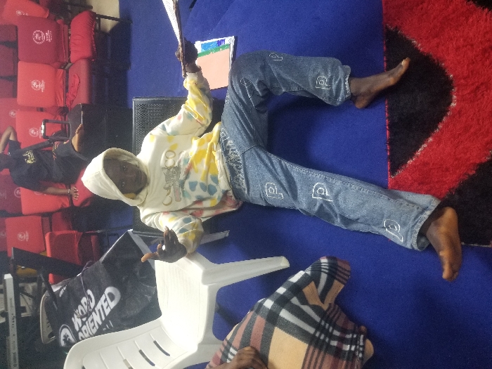 The scene depicts an indoor setting, identified as a location in Onitsha, Nigeria, with a blue carpeted floor in the foreground and a red and black patterned rug partially visible underneath. A young individual sits centrally on the blue carpet, barefoot, wearing a tie-dye hooded sweatshirt with a graphic design and light blue denim jeans patterned with repeated white "P" letters. The individual faces forward, extending the left arm with a hand gesture, and holds a stack of papers or a folded fan in the right hand. Two notebooks (red and green/blue) lie on the carpet near the individual's right leg. To the left, a white plastic chair has a black bag with "WORD ORIENTED" text draped over its back, and part of a plaid-covered leg is visible beside the main subject. In the background, rows of red chairs, some with white logos, are arranged. One person is seated on a red chair in the background, wearing dark clothing. A black speaker is positioned behind the main subject to the right, and a keyboard stand with a keyboard is visible in the far left background.