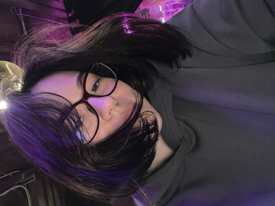 An individual is depicted in Lymanka, Ukraine, capturing a self-portrait indoors. The person has short, dark hair, wears dark-rimmed glasses, and is dressed in a dark grey hooded sweatshirt. Their face is partially obscured by hair and the camera's upward angle, with a neutral to slightly pursed expression. The environment is dimly lit with prominent purple and pink ambient lighting effects visible on the hair and in the background. A bright, possibly bare, light source is positioned above the individual's head, casting reflections. Indistinct dark structures, consistent with interior ceiling or wall elements, are visible in the background.