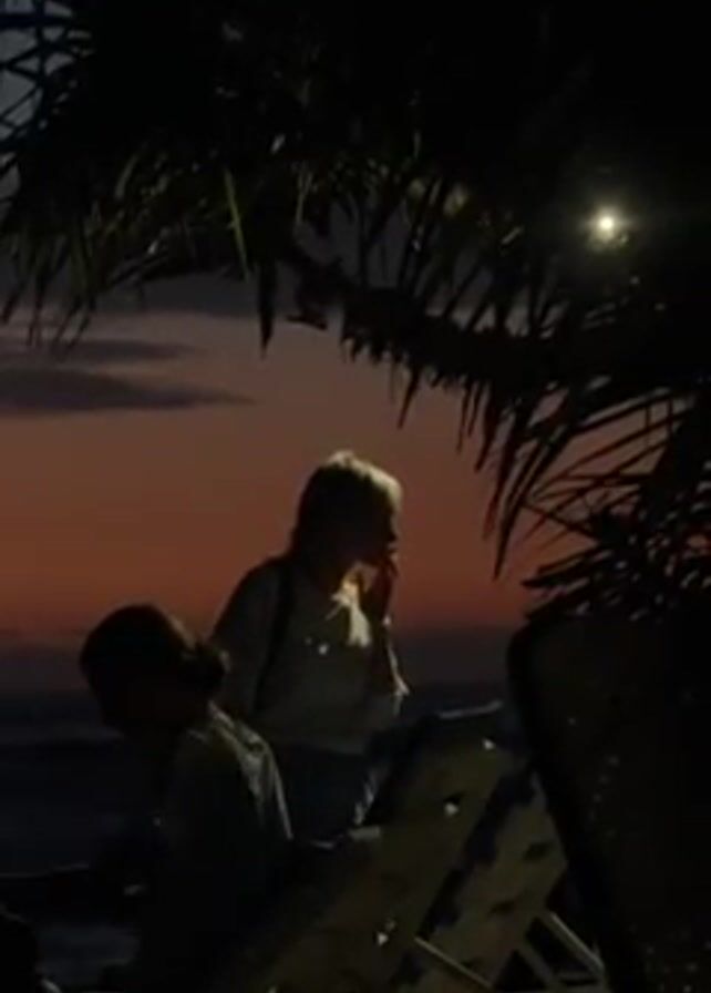 Here is a detailed description of the video: The video shows a static shot of two people at a beach at night. The sky is a mix of orange and red, indicating either a sunset or sunrise. There's a palm tree in the foreground, partially obscuring the view. One person is standing and appears to be talking on a cell phone. The other person is seated. The sea is visible in the background, though it's mostly in shadow due to the dark lighting. Some beach chairs are visible. The scene is quite dark.