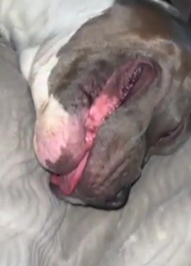 blue-gray and white pitbull dog sleeping on a gray blanket