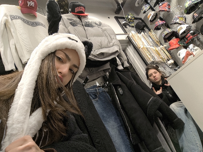 This image depicts two young adult females inside a retail clothing store located in Strasbourg, France. The foreground subject, a female with long dark brown hair, is positioned close to the camera, wearing a white plush hat with black ear-like protrusions. Her expression involves slightly pursed lips and direct eye contact with the viewer. She is wearing a dark, possibly knit, garment. In the background, to the right, a second female subject with shorter dark brown hair is partially visible behind a clothing rack. She wears a dark jacket and light blue jeans, looking towards the camera with a neutral expression while making a "rock on" hand gesture with her right hand. The store environment features multiple clothing racks and wall displays. To the left, white sweaters, one with horizontal textured patterns, are displayed alongside a red baseball cap embroidered with "NY" and a light grey puffer jacket. In the mid-ground, dark jackets, including a black shearling-lined coat, and blue denim jeans are visible on hangers. The right wall displays numerous baseball caps and bucket hats, many with diverse patterns and colors, arranged on a black grid panel. Below these hats, several gold-colored chain necklaces hang vertically on a separate display. A white counter or display unit is situated in the lower right background.