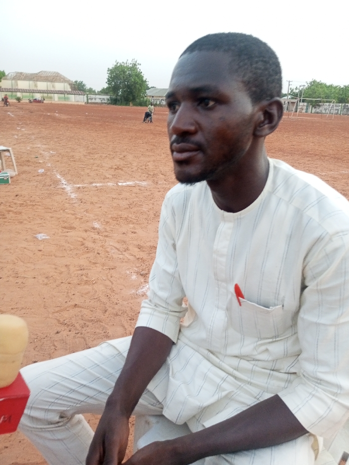 man sitting on a dirt field. He is wearing a white and light blue striped, long-sleeved shirt and white pants. He is looking to the right of the image, sitting with his arms resting on his legs, and his hands together. He has a red pen sticking out of his shirt pocket on the right side. The man is sitting in a large, open field with a building in the background. The ground is made of dirt. In the distance, two other people can be seen walking in the field. The coordinates (latitude: 12.441, longitude: 4.193) place this scene in Birnin Kebbi, Nigeria, which is likely the Birnin Kebbi Stadium, based on its proximity to the location of the stadium.