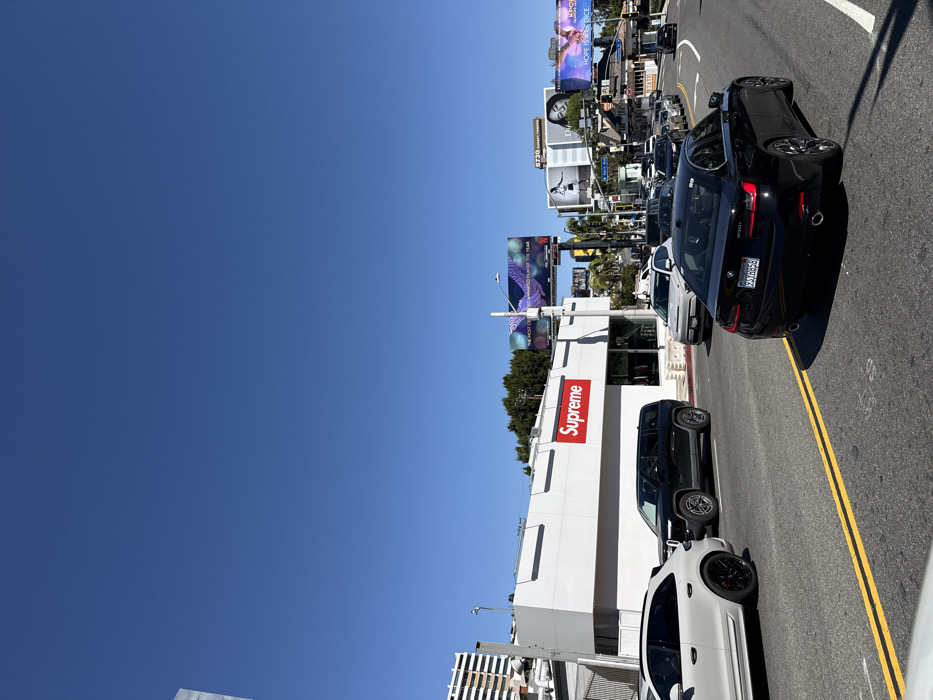 This image depicts a daylight urban street scene along Sunset Boulevard in West Hollywood, California, United States. The specific location is in the vicinity of 8800 Sunset Boulevard, indicated by the visible Supreme retail store and a billboard referencing "8730 Sunset Towers." The scene is dominated by a multi-lane asphalt road with distinct yellow double-solid center lines and white lane markings, experiencing moderate to heavy traffic congestion. A prominent white, modernist-style commercial building with a large red "Supreme" logo on its front facade stands on the left side of the street. This building features large window displays. In the immediate foreground, the partial hood of a vehicle is visible, indicating the perspective of the photograph. Directly ahead and slightly to the right, a black BMW 330i sedan (California license plate 9XYH858) is stopped or moving slowly in traffic, facing away from the camera. To its left, a white SUV and a dark-colored SUV (appearing to be a Rivian R1S) are also present in the traffic flow. Numerous other vehicles, including sedans and SUVs of various colors, are queued in multiple lanes further down the road. The sky is clear and blue. In the background, several large commercial billboards line the street, displaying diverse advertisements, including one for "8730 Sunset Towers" and another with text referring to "THE MOST CRITICALLY ANIMATED FILM OF THE YEAR." Various other commercial buildings, some with ground-level establishments, contribute to the dense urban environment. Green trees and shrubs are visible between buildings and billboards. Standard urban infrastructure elements such as traffic lights, street signs, and utility poles are present. No discernible individuals are visible outside of vehicles.