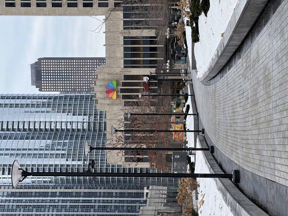 A cityscape features a paved, curved walkway lined with street lamps and snow patches. The NBC logo is prominently displayed on a building amidst others with varied architectural styles. Skyscrapers rise in the background. The sky is overcast, contributing to a subdued color palette of grays, whites, and muted tones. Bare trees and winter shrubbery dot the landscape.