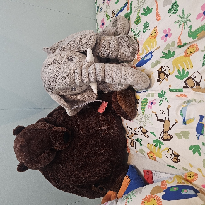 A brown plush bear lies on top of a white patterned fabric featuring lions, monkeys, and tropical plants. A gray plush elephant sits atop the bear, partially obscured by the bear's form. The fabric appears to be a bedsheet or similar textile. A small, blue and orange cushion can be seen near the bottom edge of the frame. A wall is partially visible behind the toys.