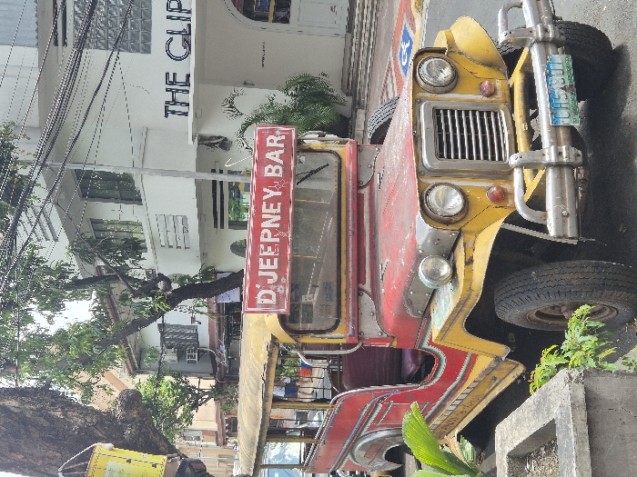 - "An aged, red and yellow jeepney, bearing a "D JEEPNEY BAR" sign on its front roofline, is parked on the side of a paved street at 103 P" by FM-RLBpB3, licensed under CC BY 4.0