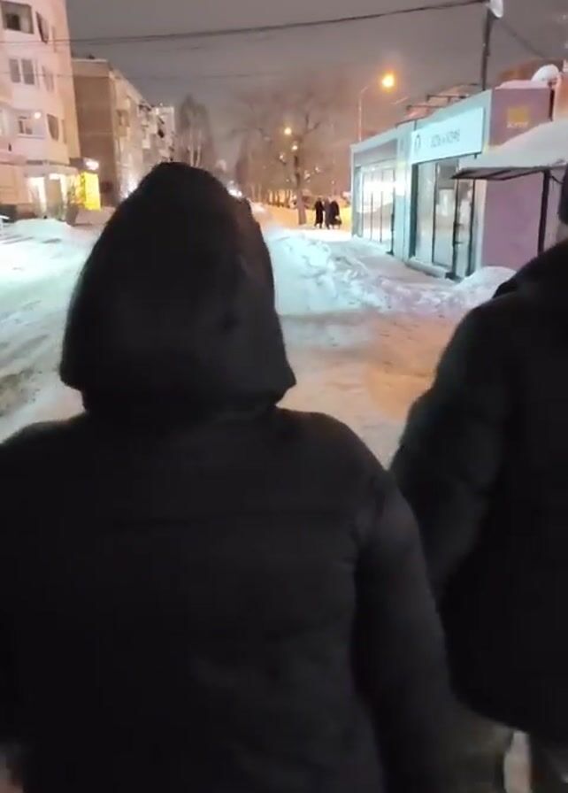 two people walking away from the camera down a snow-covered sidewalk in an urban environment at night. The two people in the foreground are wearing dark winter coats with hoods. Other pedestrians are visible in the distance, also walking on the sidewalk. There are buildings on either side of the street, and streetlights illuminate the scene. A small building with glass windows is visible on the right side of the sidewalk, with a sign in Russian that reads "Есть и кофе." The ground is covered in packed snow, and the sky is overcast.