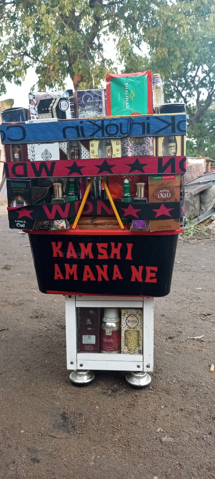 The image displays a multi-tiered mobile vendor's display stand situated outdoors on a dirt and gravel surface in Adankolo, Nigeria. The stand is approximately 1.5 to 2 meters in height. The base consists of a white rectangular cabinet with a clear front, resting on four chrome-colored, circular metallic feet. Inside this lower compartment, several products are visible, including a silver container labeled "Lovely" and a white box with green and gold patterns labeled "BUSHRA." Immediately above the base is a black rectangular container featuring the words "KAMSHI AMANA NE" in red capital letters. This section houses numerous small bottles, identified as concentrated fragrance oils or perfumes, some with green caps, held in place by two slender yellow vertical rods. A red ribbon with black star patterns encircles this section. The upper tiers of the stand are densely packed with various boxed fragrance products and small bottles. These items are partially secured by a blue fabric strip with white text. Visible product packaging includes a green and red pouch labeled "SHALIMAR," boxes for "M-Nahdi Sugar Baby," "Silver," "Arabian Oud," "Klooud Concentrated Attar Roll On," and "Black Oud." The ground beneath the stand is an unpaved surface of light brown dirt and small gray gravel. A single cigarette butt is visible on the ground to the lower right of the stand's base. In the background, a large tree with abundant green foliage stands beneath a bright, possibly overcast, sky. No individuals or explicit actions are depicted in the scene.