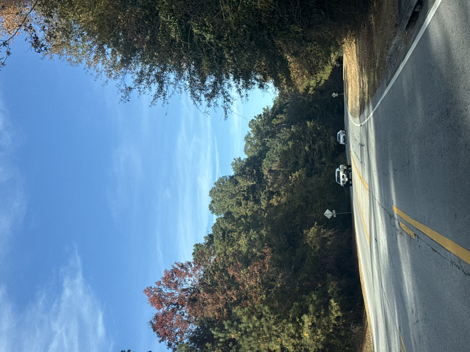 A road curves through a wooded area on a sunny day. The sky is blue with wispy clouds. Trees line both sides of the road, some with autumn foliage. Two vehicles are parked on the roadside. Yellow lines mark the road lanes. The lighting suggests it's daytime.
