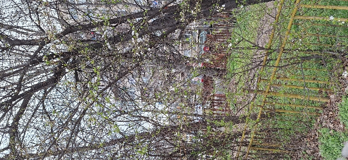 This vertical image depicts an outdoor urban environment in Sofia, Bulgaria, under daylight conditions, indicative of the spring season. The lower third of the frame is occupied by a weathered yellowish-brown wooden fence or railing, positioned above ground covered in green vegetation and scattered brown leaf litter. The midground features numerous deciduous trees, many exhibiting small white blossoms and nascent green leaves, partially obscuring a paved street. Several motor vehicles are parked along this street, including a red car and a light-colored sedan. Behind the street, a darker wooden fence is visible, followed by multi-story residential buildings characterized by numerous windows, partially veiled by the tree canopy. No human figures or specific dynamic actions are present.