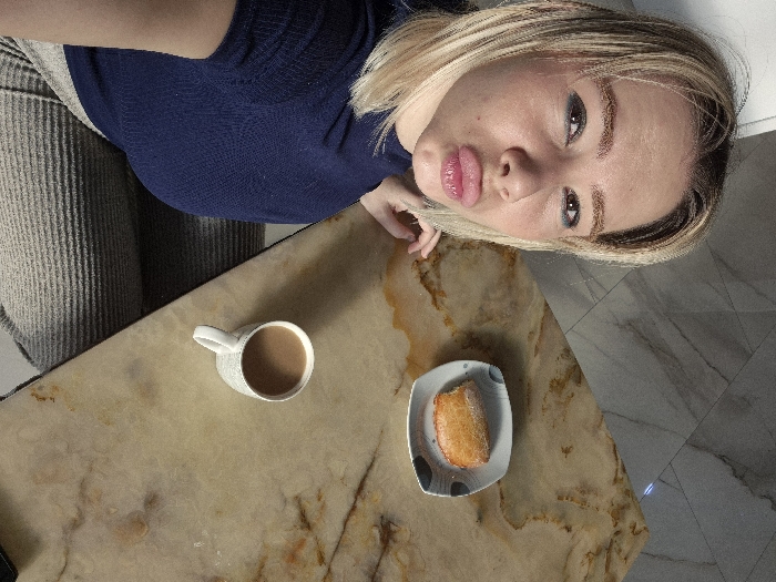 A woman with blonde hair and blue top is positioned above a table. On the table, there is a mug of coffee and a pastry on a small, decorative plate. The tabletop has a marbled effect, with light and dark tones creating a patterned surface. The background includes a glimpse of the woman's clothing and tiled flooring.