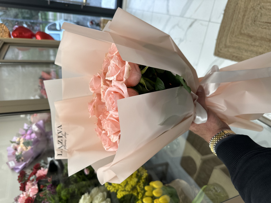 A person's left hand, wearing a dark long-sleeved garment and a gold-toned wristwatch with a jubilee-style bracelet, holds a bouquet of approximately 15-20 light pink roses. The bouquet is wrapped in multiple layers of light pink paper or film and secured with a pale pink or white satin ribbon. A white card with "LAZIVA flower shop" printed in black is visible within the upper portion of the wrapping. The scene is set inside a flower shop, identified as Laziva flower shop, located at Trg Sunca 1, Budva, Montenegro. In the background, to the left of the bouquet, other floral arrangements are visible, including red and pink cut flowers and yellow tulip-like flowers in a pot. The shop floor features large, light-colored, possibly marble, tiles. A woven light brown mat is partially visible on the floor to the right. Through a large glass window or door in the background, a blurred exterior view shows a street or sidewalk and a partial outline of a white vehicle. Red heart-shaped balloons are also visible inside the shop, positioned near the entrance or reflected in the glass.